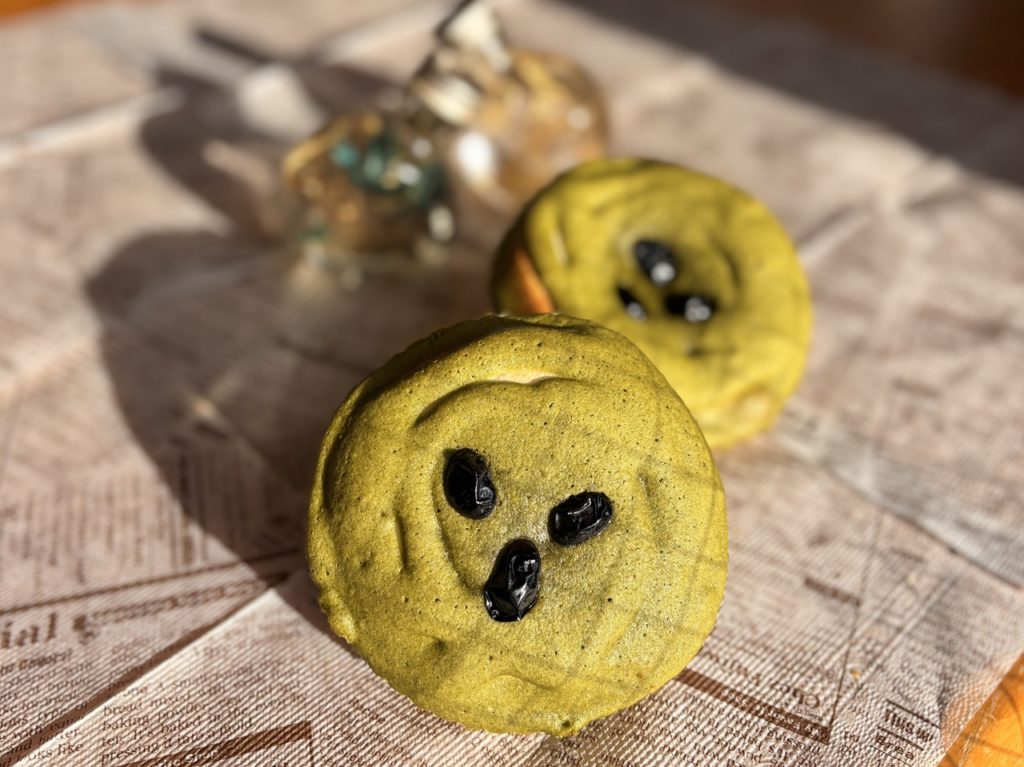 抹茶風味の生地でパン全体を覆った菓子パンです。